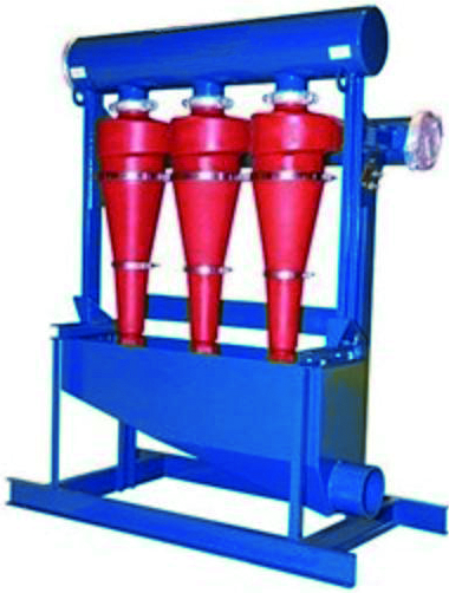 鉆井泥漿在振動篩倉經過砂泵輸送到除砂旋流器中,在砂泵的壓力下,泥漿流的沖擊力下,鉆井泥漿在旋流器中形成旋渦狀而鉆井液中的固體在離心力和重力的作用下,沉降到旋流器底部,最后經由滴流嘴噴射出來。固體顆粒會在底流篩進行進一步的篩分和過濾。而輕一些的,干凈的液體將通過旋流器組的排出管線直接流到除砂倉內。